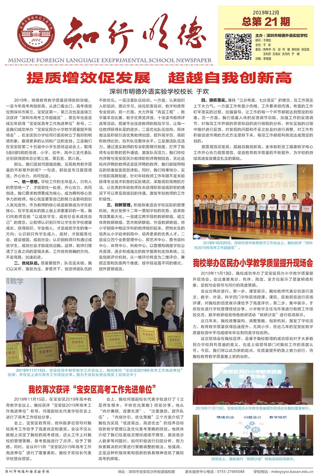 2019年,明德教育教学质量获得新的突破。一是今年高考再创新高,从进口看出口,高考绩效位列深圳市第三、宝安区第一,第三次也是连续三次获评“深圳市高考工作超越奖”,第五年也是连续五年获得“宝安区高考工作先进单位”称号。